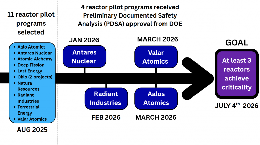 The DoE Reactor Pilot Program was established in response to Executive Order 14301, which has as one goal: fast-tracking advanced reactor technologies toward commercial licensing. Announced in June 2025, the program’s objective is to have at least three reactors achieve criticality by July 4, 2026. The program does not specify if this needs to be cold criticality or full power. Radiant Industries has stated that it intends to operate the Kaleidos reactor for 60 effective full power days. Valar Atomics announced that it achieved zero-power criticality in November 2025.